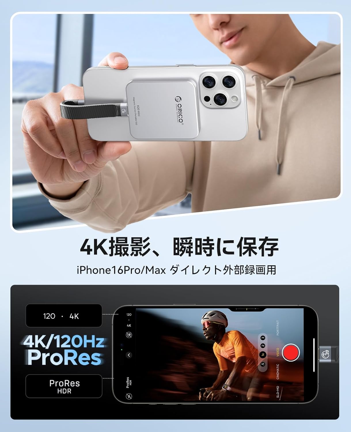 【ProRes 4K 120 fps】O SSD externo ORICO K20MINI permite armazenar diretamente os arquivos durante a captura de fotos. Salve os dados de gravação ProRes HDR do seu iPhone 16 Pro/Pro Max sem precisar editá-los. Reduza o incômodo de ter que transferir os arquivos duas vezes.